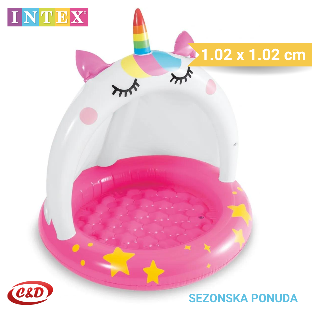 Jedinstveni oblik jednoroga čini ovaj bazen izuzetno privlačnim za djecu, potičući njihovu maštu i igru. Osim zabavnog dizajna, bazen dolazi s integriranom zaštitom od sunca koja štiti najmlađe od štetnih UV zraka, omogućavajući bezbrižno igranje na otvorenom.