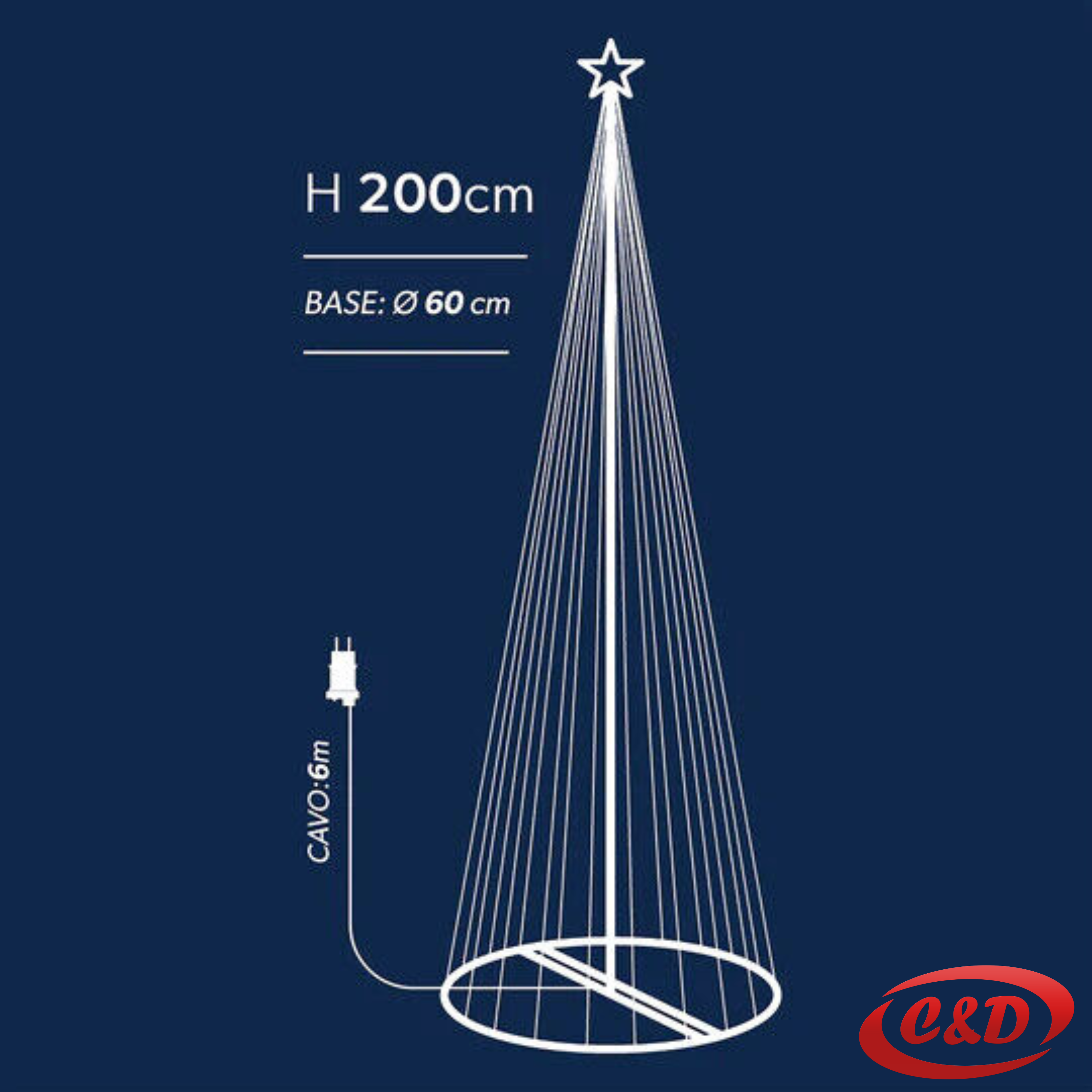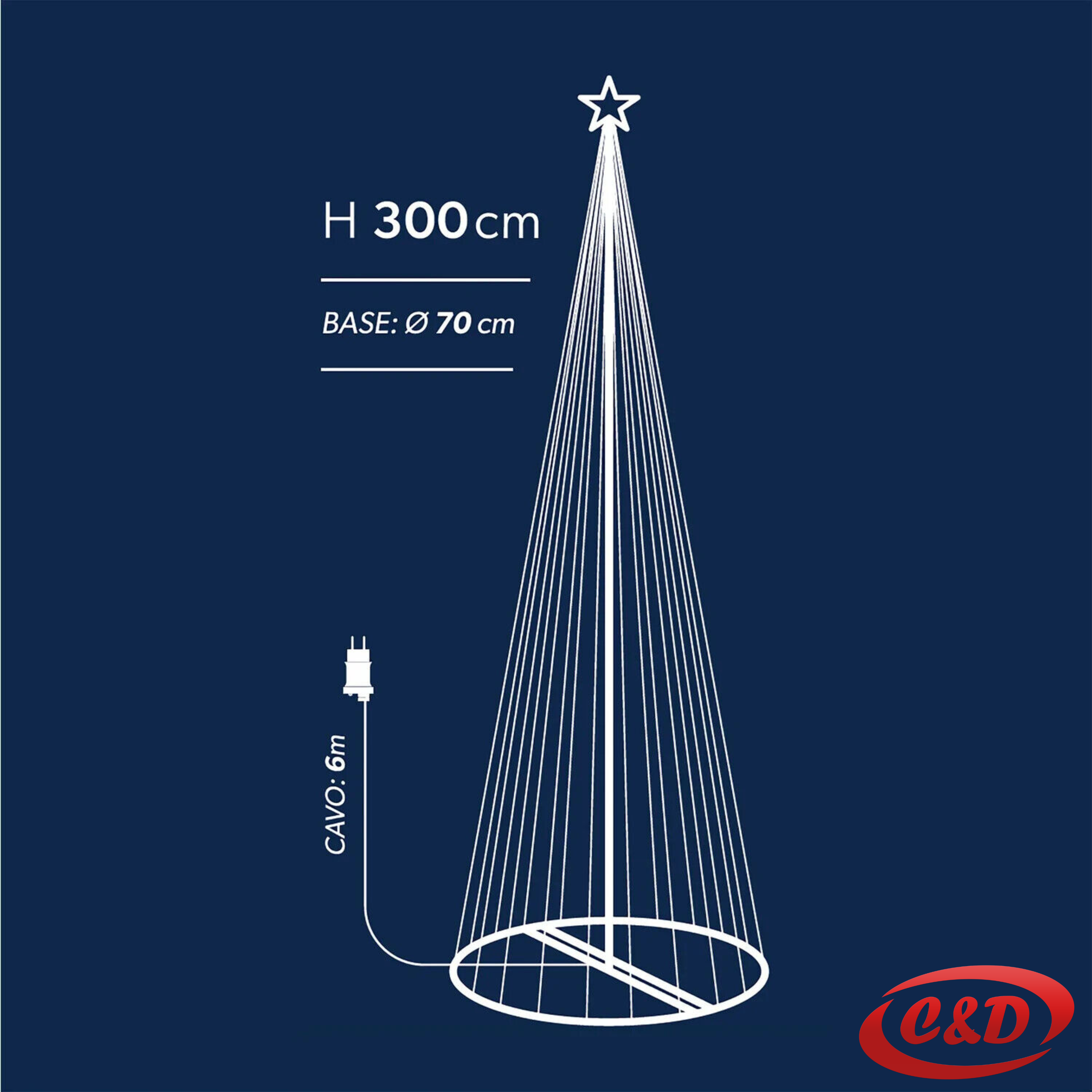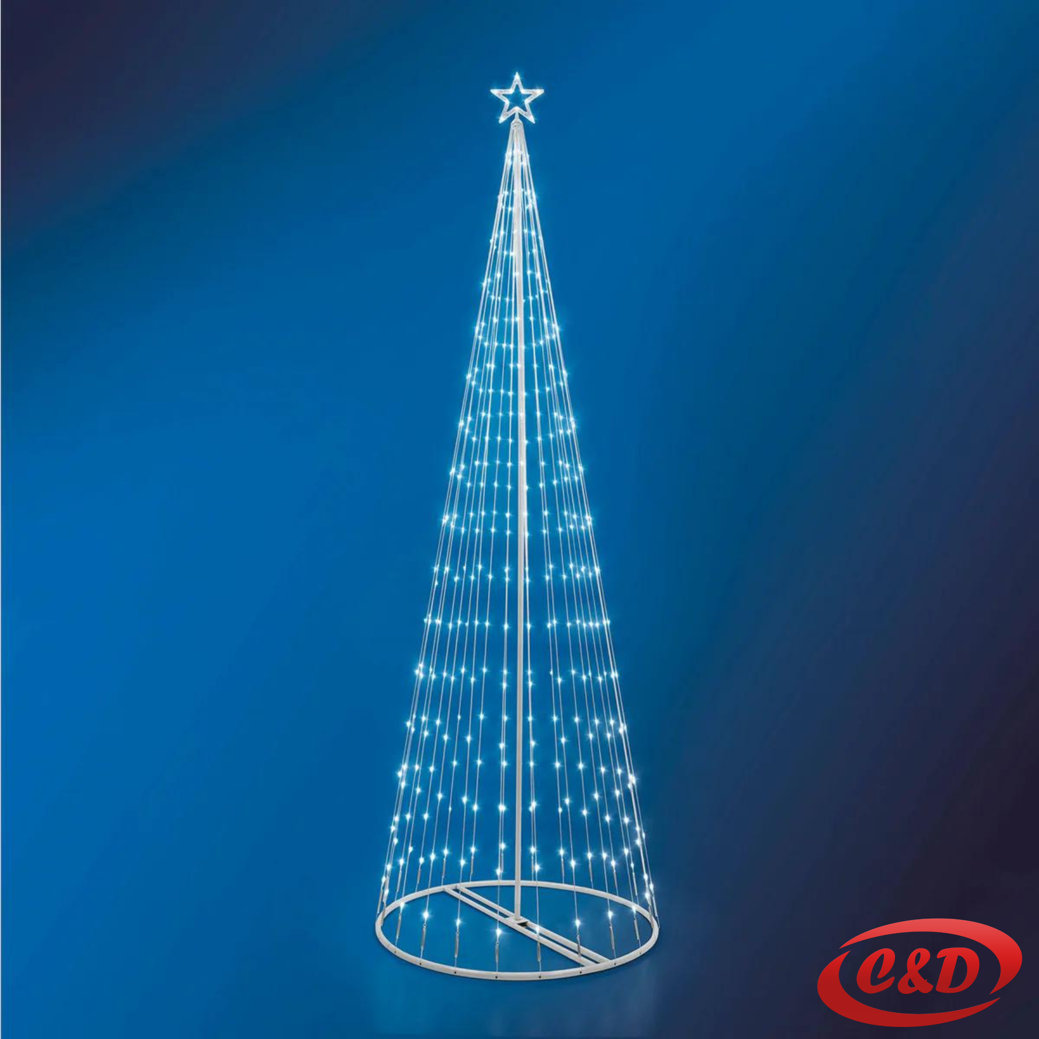 Elegantno LED dekorativno drvce visine 300 cm s obruča promjera 70 cm sadrži 394 bijele LED lampice raspoređene na 10 krakova, stvarajući impresivan i blistav efekt u unutarnjim prostorima.
