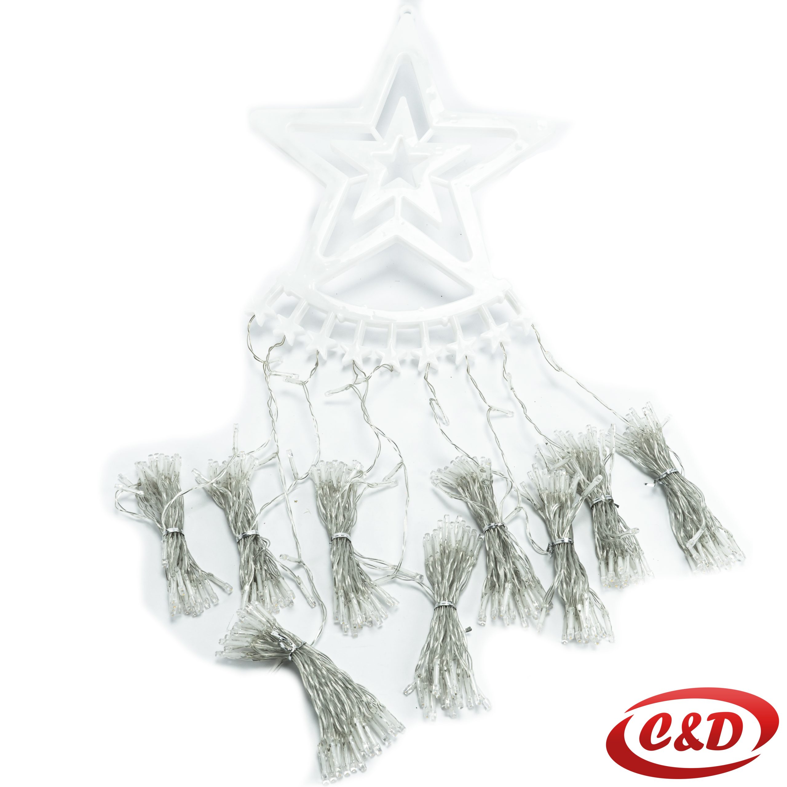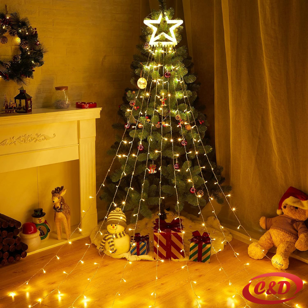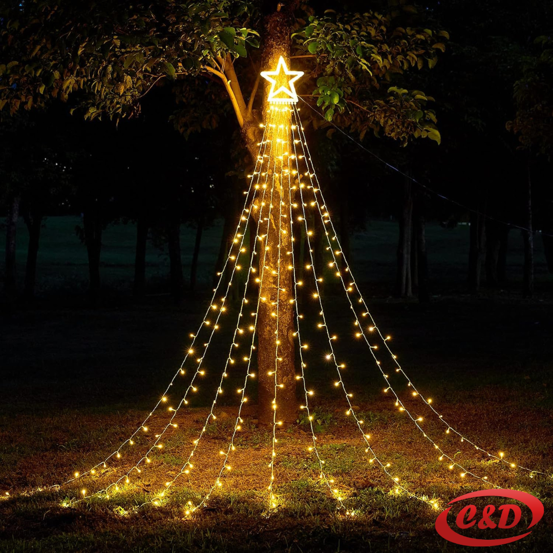 Fantastično uređenje: 305 LED lampica s 9 linija vodenog toka i zvjezdastim vrhom, koje vas uvode u vilinski svijet sa zvjezdastim toplim bijelim svjetlima, stvarajući ugodan i festivalski ugođaj za vaš dom, uključeno je i 9 šiljaka, savršeno za rad na otvorenom.